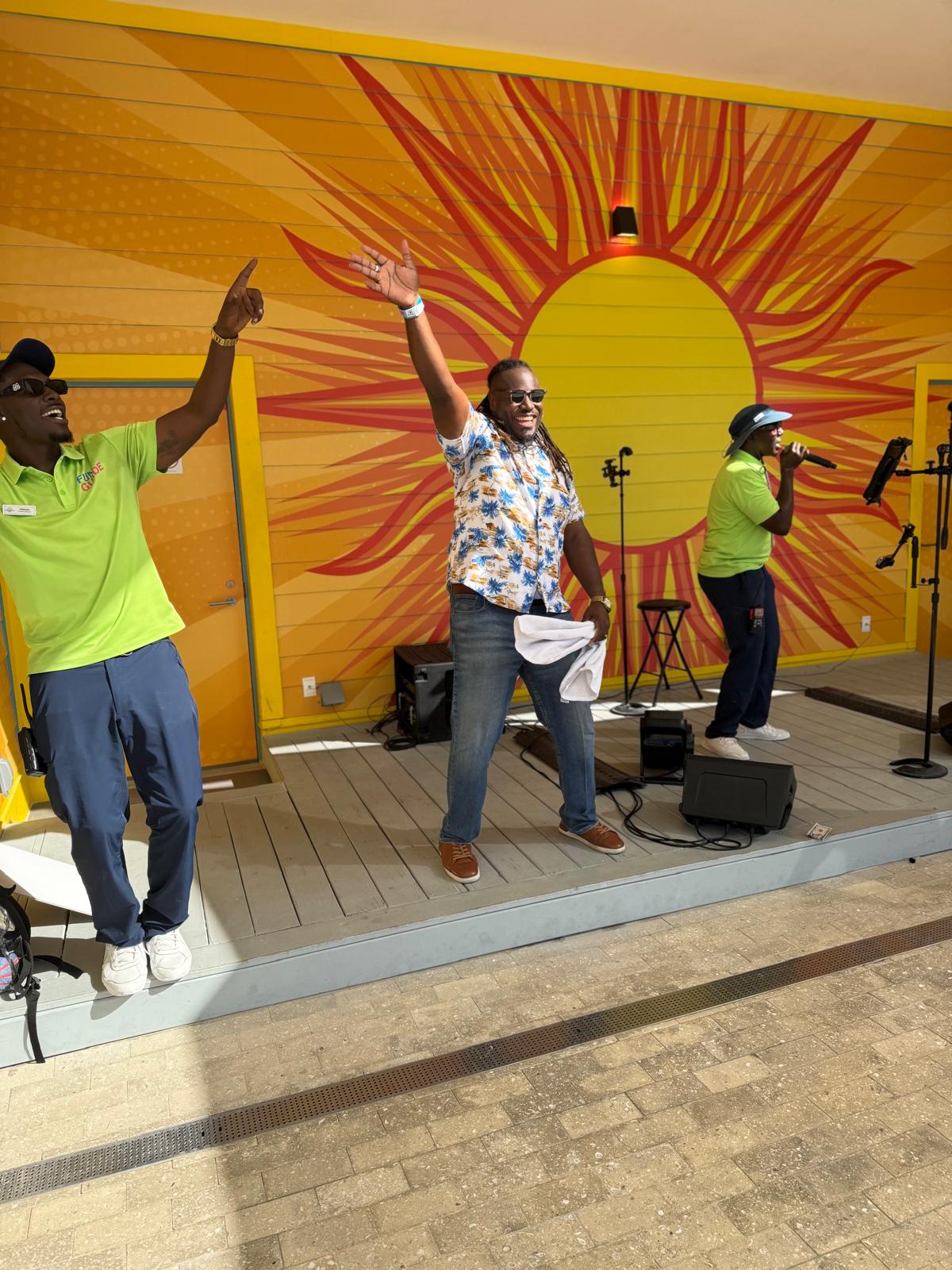 Today, Deangelo performs the morning shift at Celebration Key, greeting arriving cruise guests with live vocal performances. The role not only brought him and his family back home but gave him a chance to establish himself as a professional entertainer. “Everyone knows me as a drafter and a designer,” he said. “Now I can establish myself as a performer. Celebration Key is a huge opportunity to open up possibilities for me.” His harmonica has become an unexpected attraction for visitors who stop to listen, film, and share his performances online. “There are very few musicians, especially in the younger generation, who play the harmonica,” he said. “That really attracts a lot of tourists when I’m performing.”